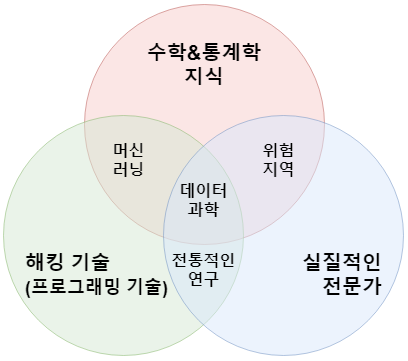 아래의 그림은 "해커 스타일로 배우는 기계학습(원서: Machine Learning for Hackers)"를 쓴 드류 콘웨이가 그린 데이터 과학을 설명한 벤다이어그램입니다.(한글번역)