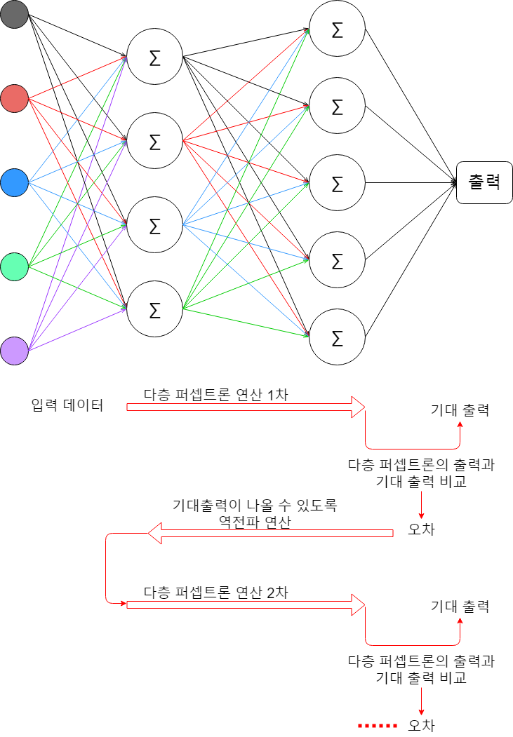 계산된 출력 값이 우리가 원하는 기대 출력값과 같은지 비교하고 오차가 있다면 해당 오차를 역방향으로 각 층의 퍼셉트론으로 전파하여 원하는 값이 나올 수 있도록 가중치를 수정합니다.