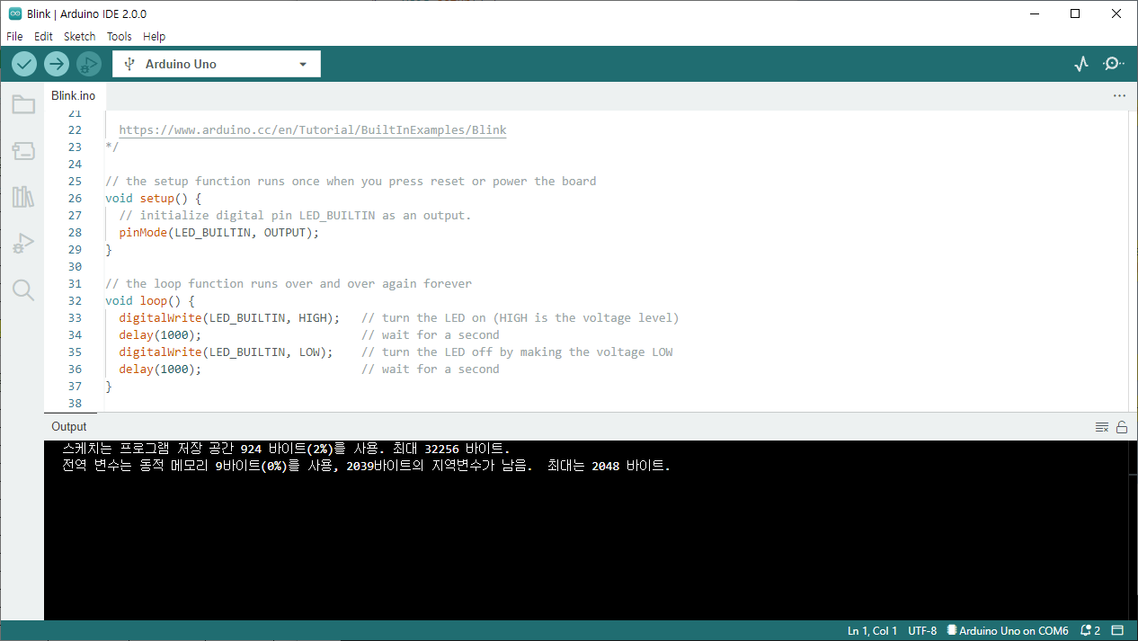 이제 아두이노를 작동시키면 보드에 장착된 LED가 깜빡이는 것을 볼 수 있습니다.
