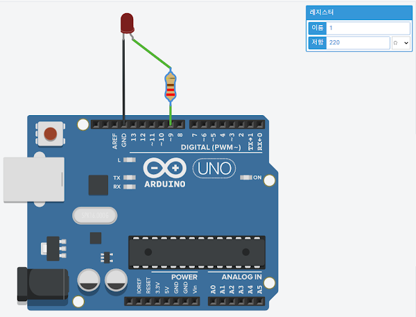 9번 핀과 저항을 연결하고, 저항의 반대쪽 단자와 LED의 플러스(+) 단자를 연결한 후, LED의 마이너스(-) 단자와 그라운드(GND)를 연결하면 됩니다.