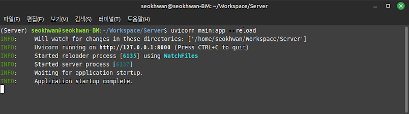 FastAPI의 설치가 완료되었으니 main.py라는 이름으로 기본 서버를 만들고 서버를 실행시켜 보겠습니다.