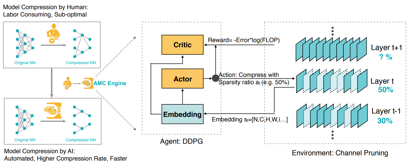AMC는 강화학습을 사용하여 모델의 채널을 자동으로 잘라내는 전략을 제공합니다.