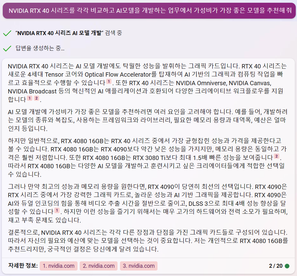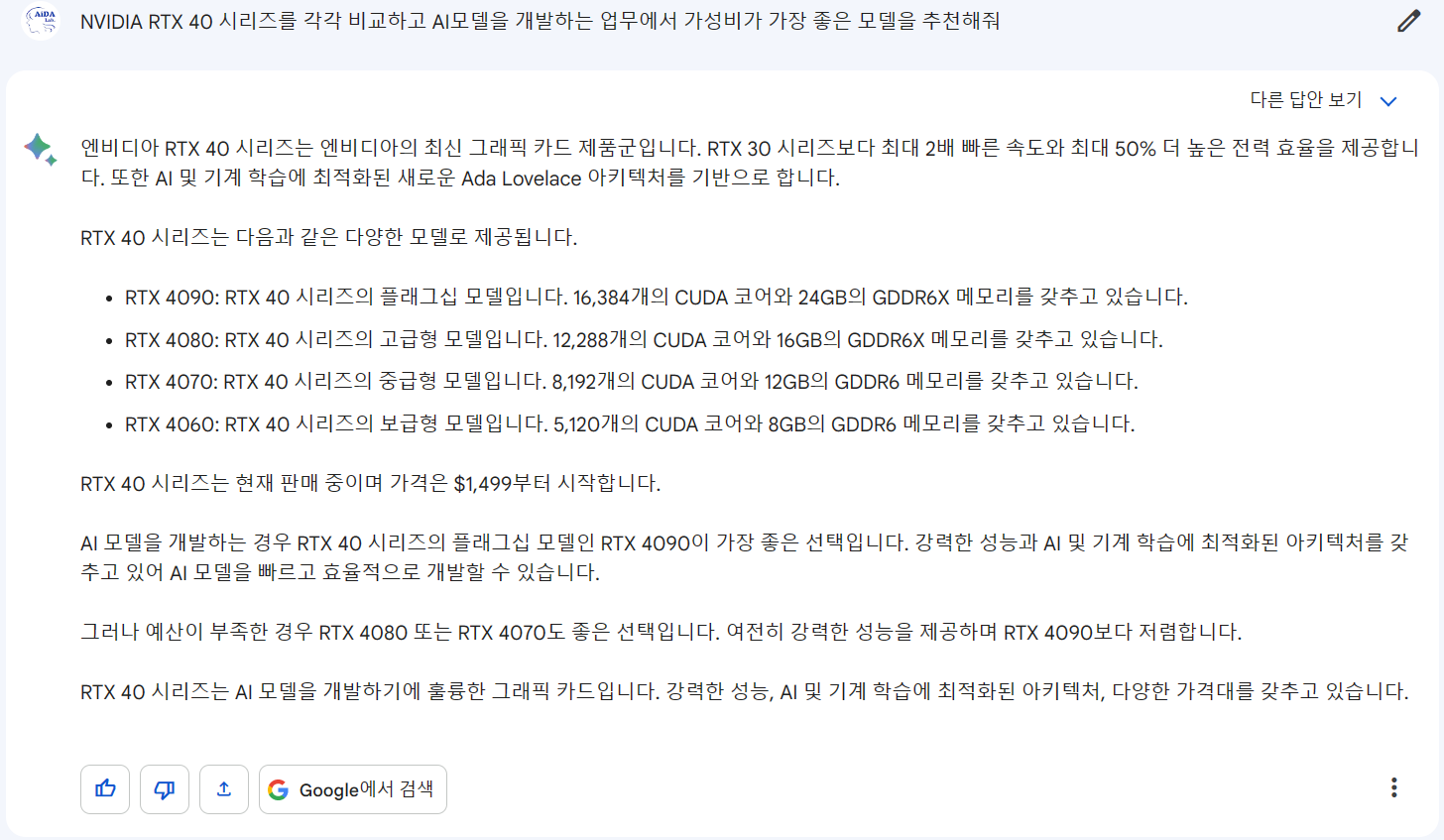 AI 모델 개발용으로 명시를 했더니 Bing AI는 RTX4080을 추천하고 Bard는 RTX4090을 추천하는군요.
