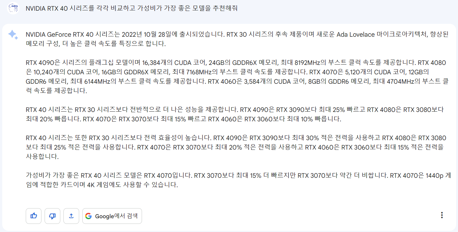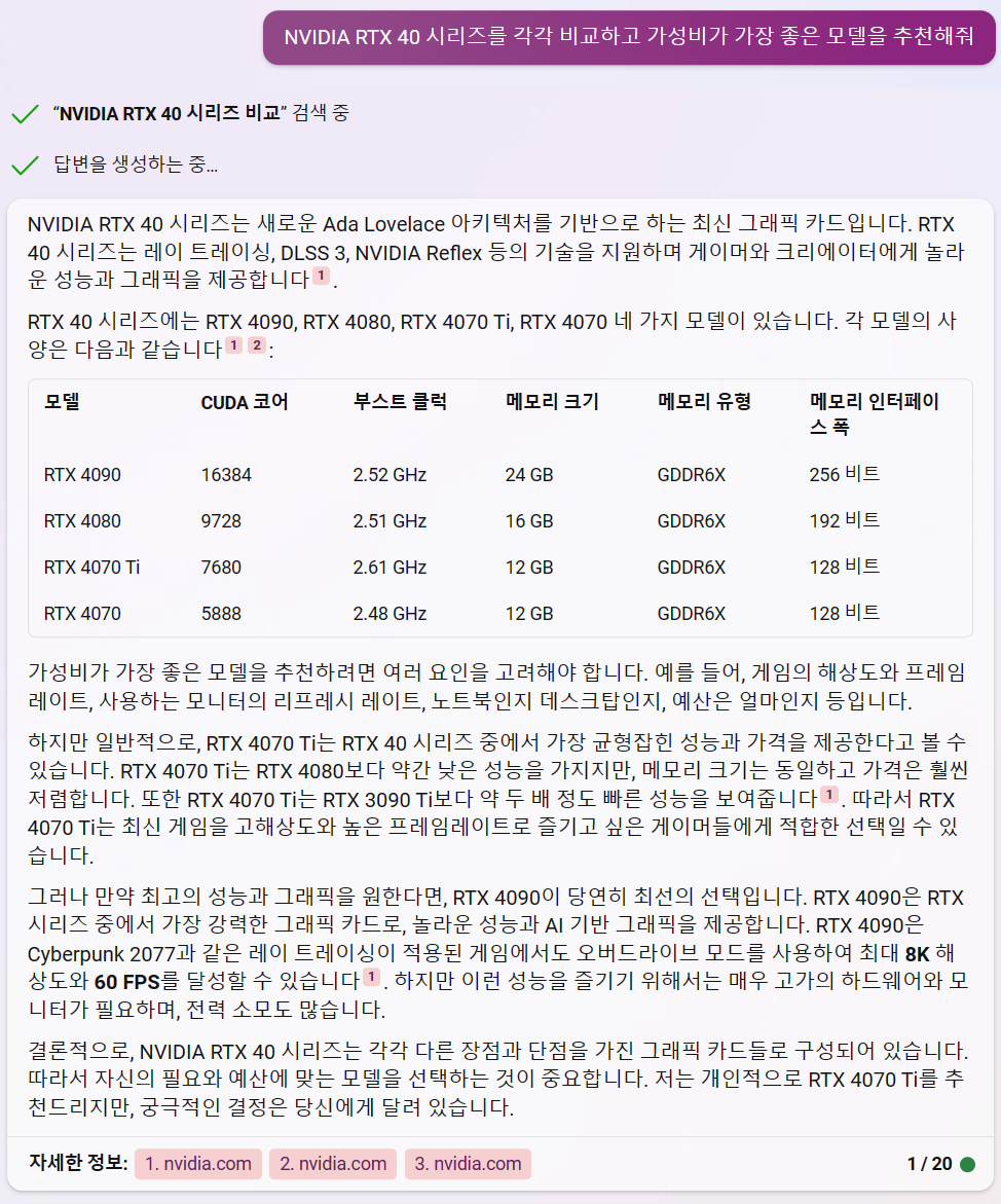 일단은 RTX40 모델 중에서 추천해 달라고 해 보았습니다.