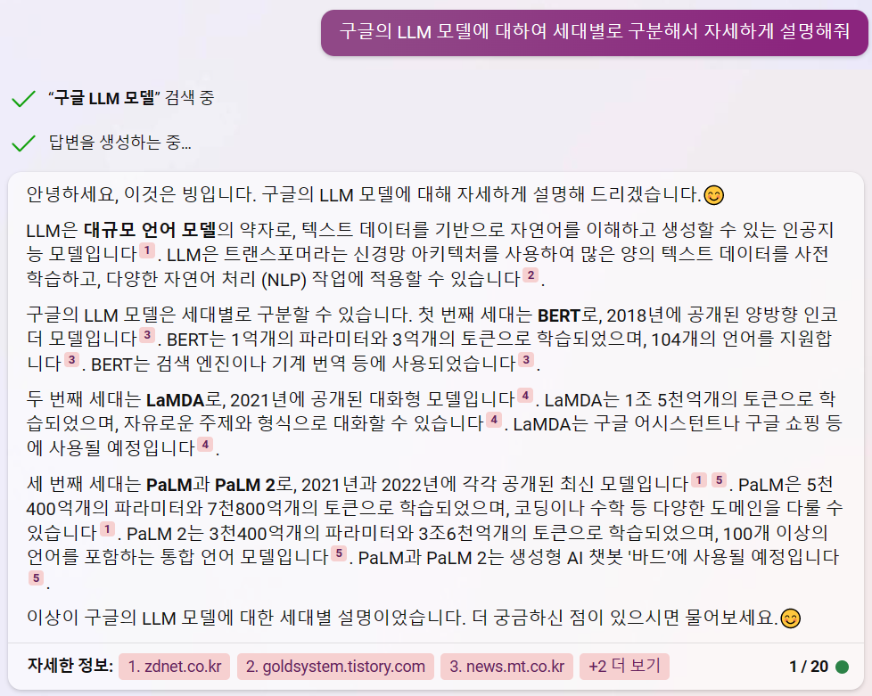 Bing AI의 경우는 한글로 된 질문/답변과 별로 차이가 없습니다.