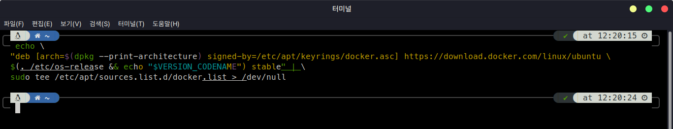 아키텍처 정보는 패키지 정보를 읽어서 적용하고(그냥 amd64로 지정해도 무방), 앞에서 (두 번째 방식으로) 생성한 키를 적용하고, os의 릴리즈 정보를 읽어서 버전코드명을 넣어주도록 하고... 그리고 그 내용들을 /etc/apt/sources.list.d/docker.list 파일에 적용한 후 반영하는... 복잡한 방식입니다.