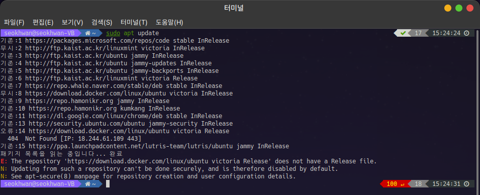 도커의 갱신 목록에 Victoria라는 릴리즈가 발견되지 않았다는 오류인데.. Victoria 릴리즈는 Linux Mint의 릴리즈 중 하나 입니다.