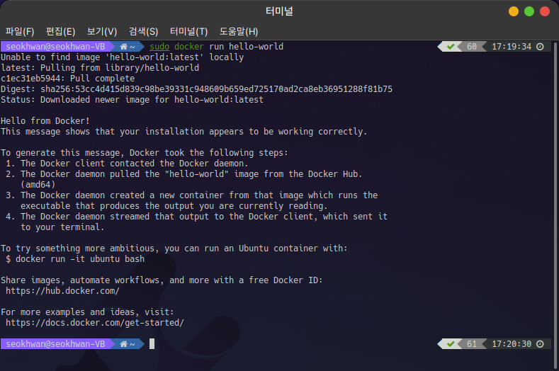 hello-world 이미지가 실행되고 "Hello from Docker!....." 결과가 출력되는 것을 확인했습니다.