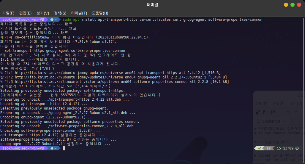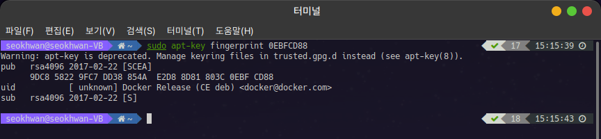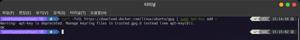 역시 apt-key가 deprecated 되었다는 경고가 나오긴 하지만 정상적으로 작동합니다.