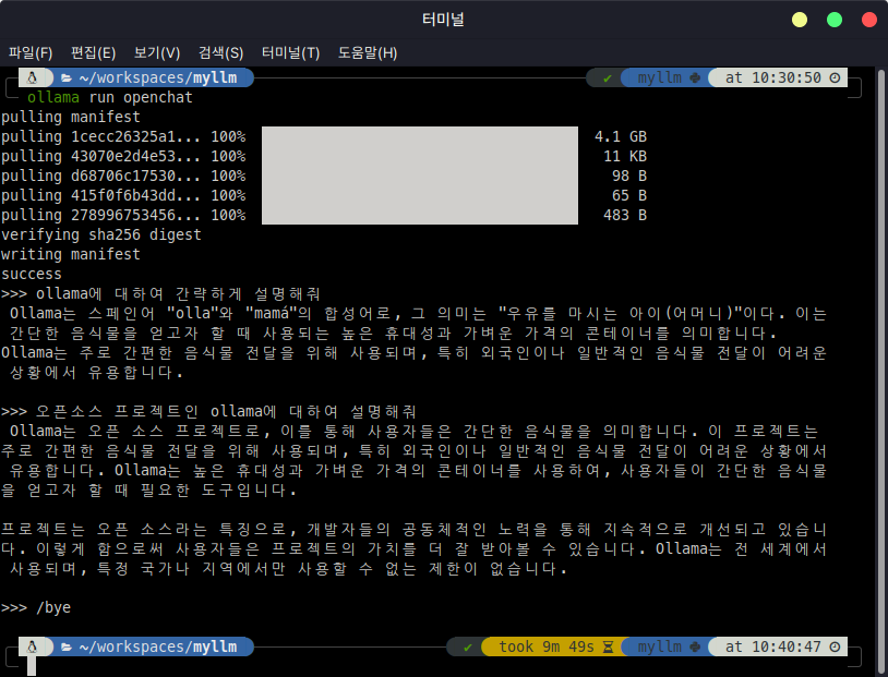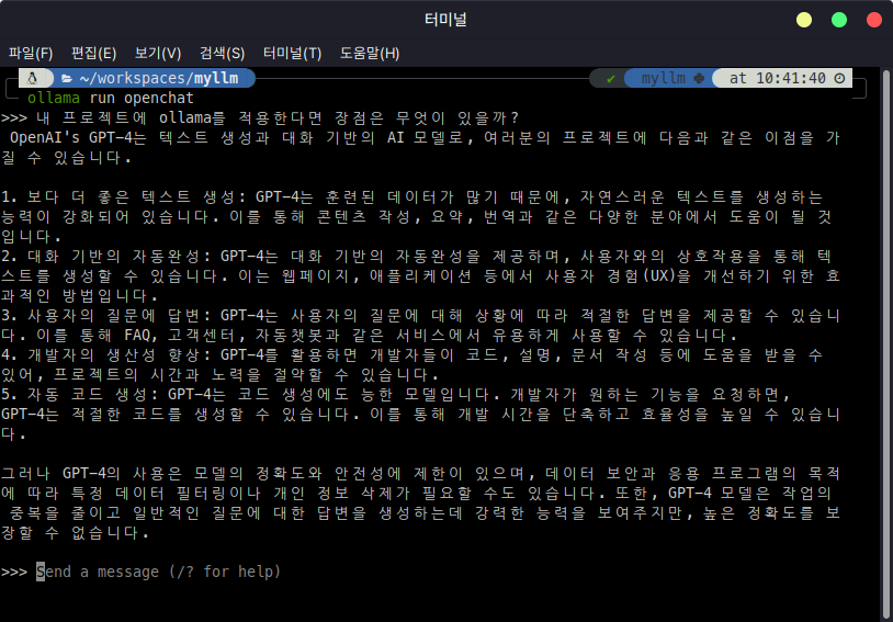 이런 식으로 간단하게 제 로컬 시스템에 LLM을 설치하여 사용할 수 있게 되었습니다.