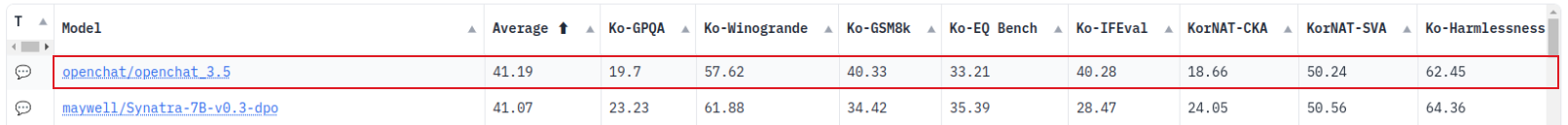 OpenChat 모델을 선택한 이유는 OpenChat 모델이 리더보드 1위이기도하지만 Open Ko-LLM LeaderBoard에 나오는 모델의 상당수는 Ollama가 지윈하는 모델에 포함되어 있지 않기 때문입니다.