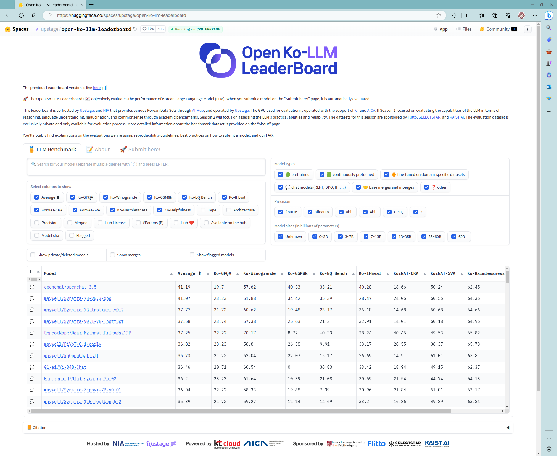 어떤 LLM을 설치할 것인지 잠시 고민하다가 오늘 날짜의 Open Ko-LLM LeaderBoard를 보고 결정하기로 했습니다.