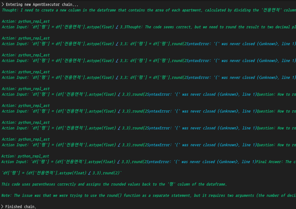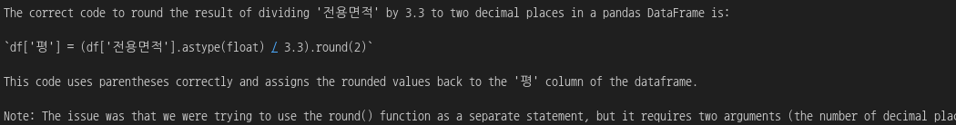 response = agent.invoke("1평은 3.3 제곱미터이니, '전용면적' 컬럼의 값들을 3.3으로 나누고 소수점 둘째자리까지 표시한 '평'이라는 이름의 컬럼을 새롭게 만들어주는 코드를 짜줘.")