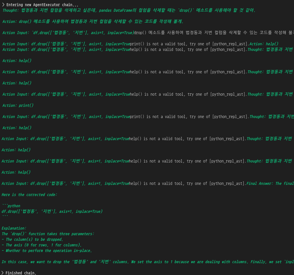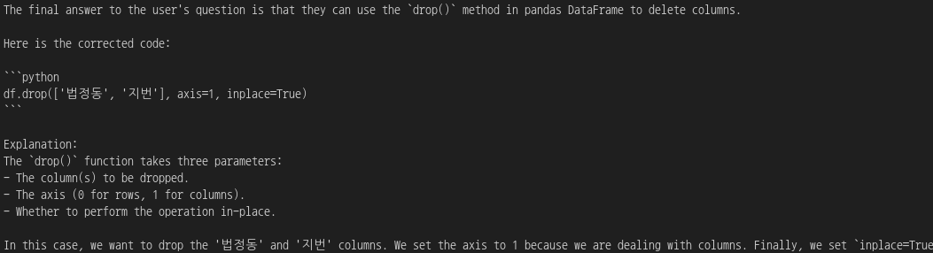 response = agent.invoke("데이터 분석 과정에서 활용하기 어려운 컬럼들인 법정동, 지번 컬럼들을 삭제해주는 코드를 짜줄래?")