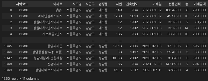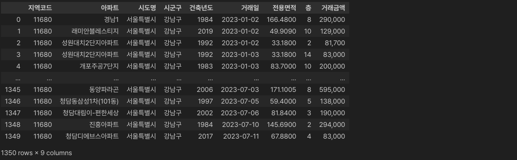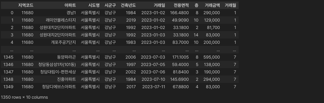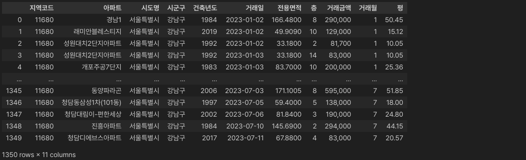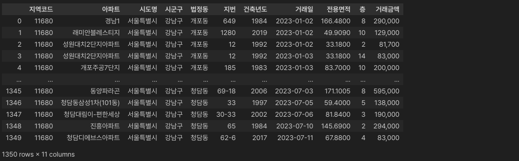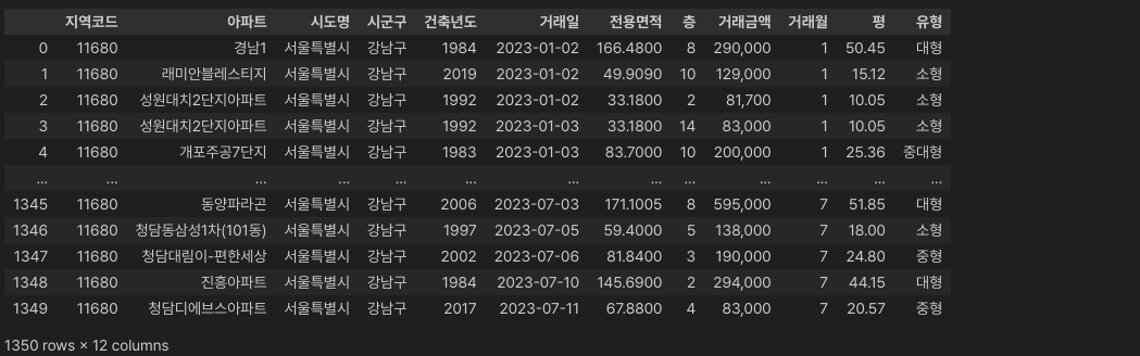 데이터셋은 https://github.com/HelloDataScience/ 에서 제공하는 APT_Price_GangNamGu_2023_20230731.txt 데이터셋을 사용하겠습니다.