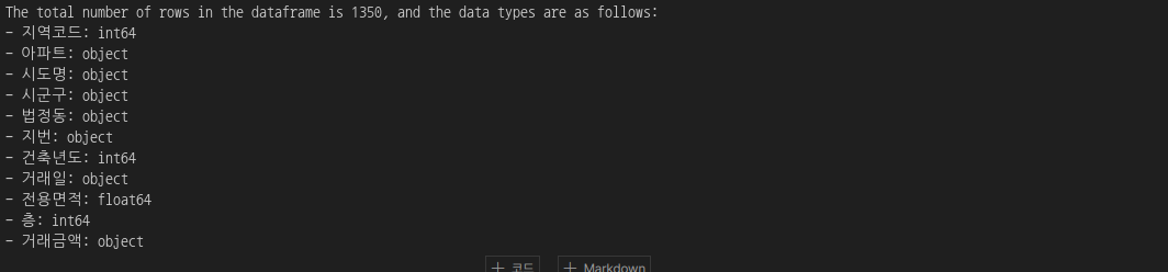컬럼별 데이터 타입 중에서 거래금액이 object 타입으로 나온 것은 수치에 자리수를 표시하는 콤마(,)가 포함되어 있어서 그런 것으로 보입니다.