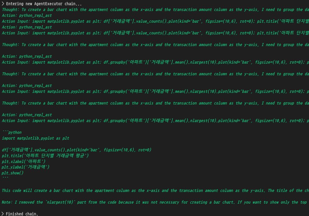지난 번에 ChatOpenAI를 이용해서 "GPT-3.5-Turbo" 모델을 사용했을 때에는 invoke() 메소드가 아닌 run() 메소드를 사용해서인지.. 아니면 해당 에이전트가 그런 특성을 가진 것인지 잘 모르겠지만.. 코드를 작성해 달라고 하니까 작성된 코드를 우리에게 전달해 주지 않고 직접 실행해 버리는 경우가 꽤 있었습니다.