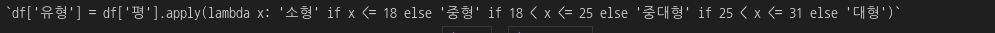 df['유형'] = df['평'].apply(lambda x: '소형' if x <= 18 else '중형' if 18 < x <= 25 else '중대형' if 25 < x <= 31 else '대형')