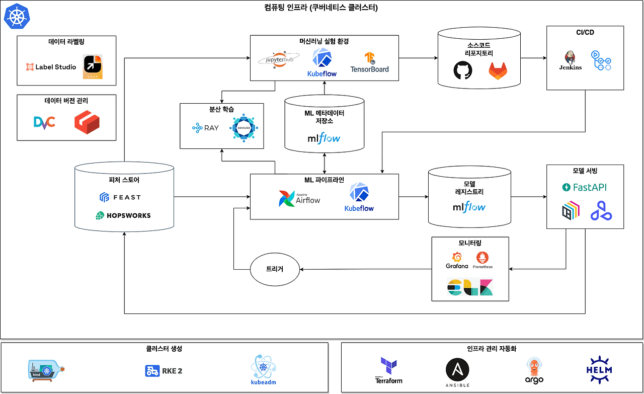 이 아키텍처는 오픈소스 도구들로 구성되어 비용을 절감하면서도 MLOps의 핵심 기능을 제공합니다.