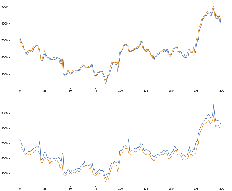 가장 위의 그래프는 시가와 종가를 보여주고 두 번째 그래프는 저가와 고가를 보여줍니다.