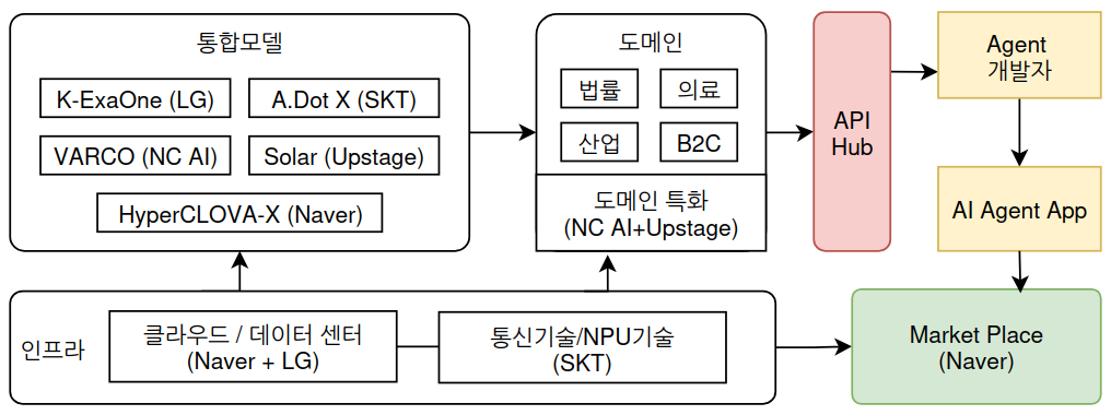 과학기술정보통신부에서 주관, 추진하는 "독자 AI 파운데이션 모델" 사업에서 네이버 클라우드, 업스테이지, SKT, NC AI, LG경영개발원 AI연구원의 5개 컨소시엄이 정예팀으로 선정되었습니다.