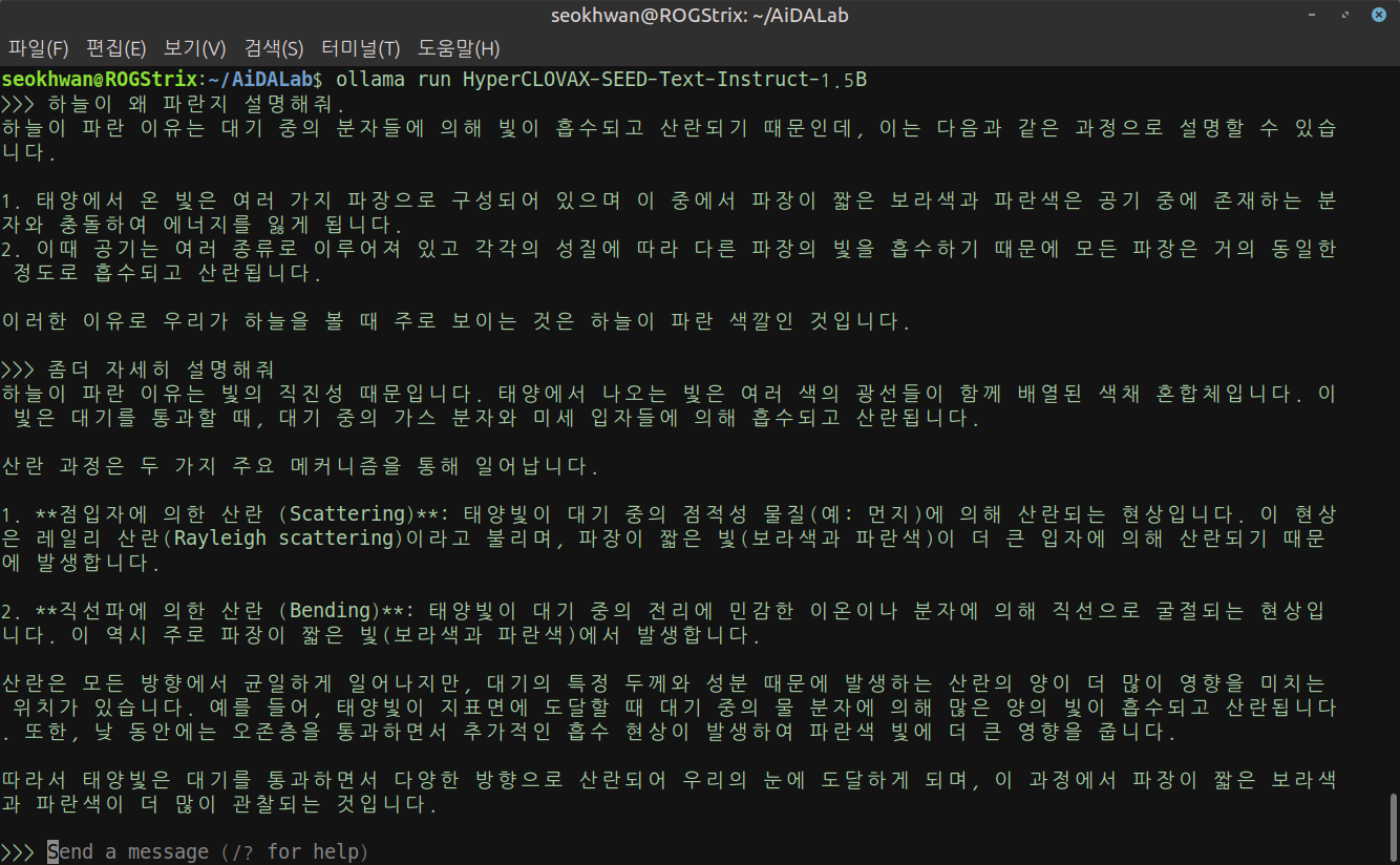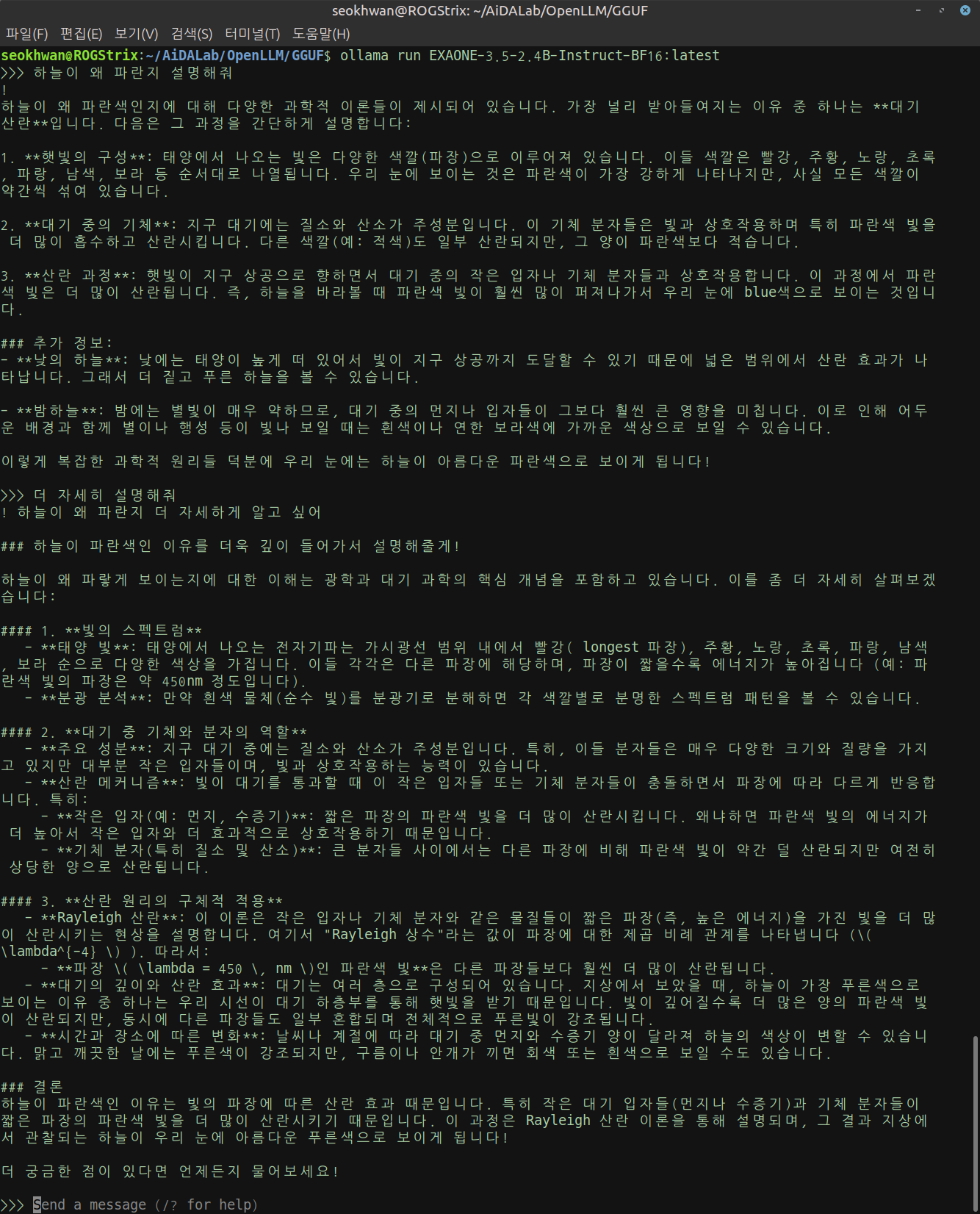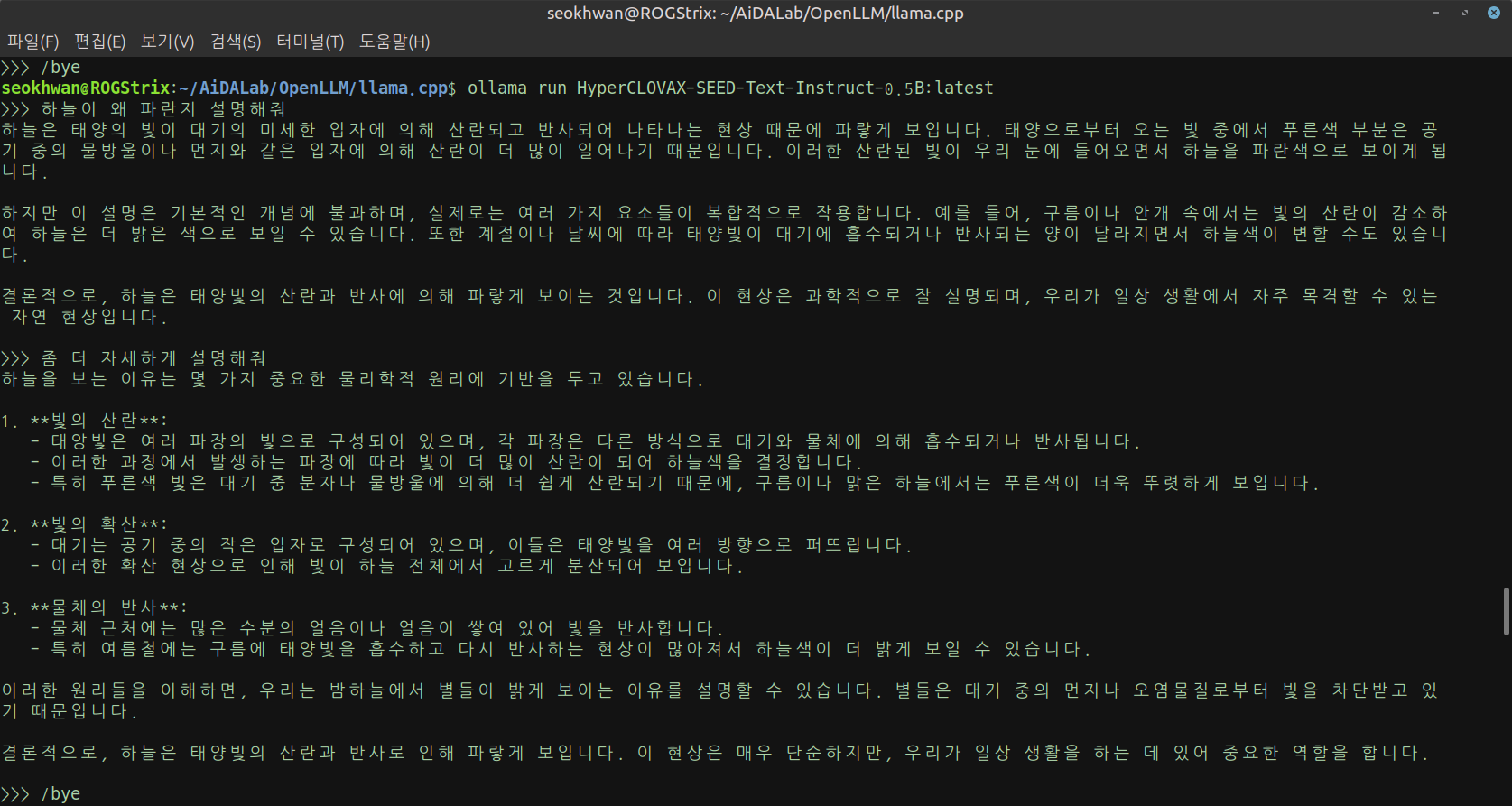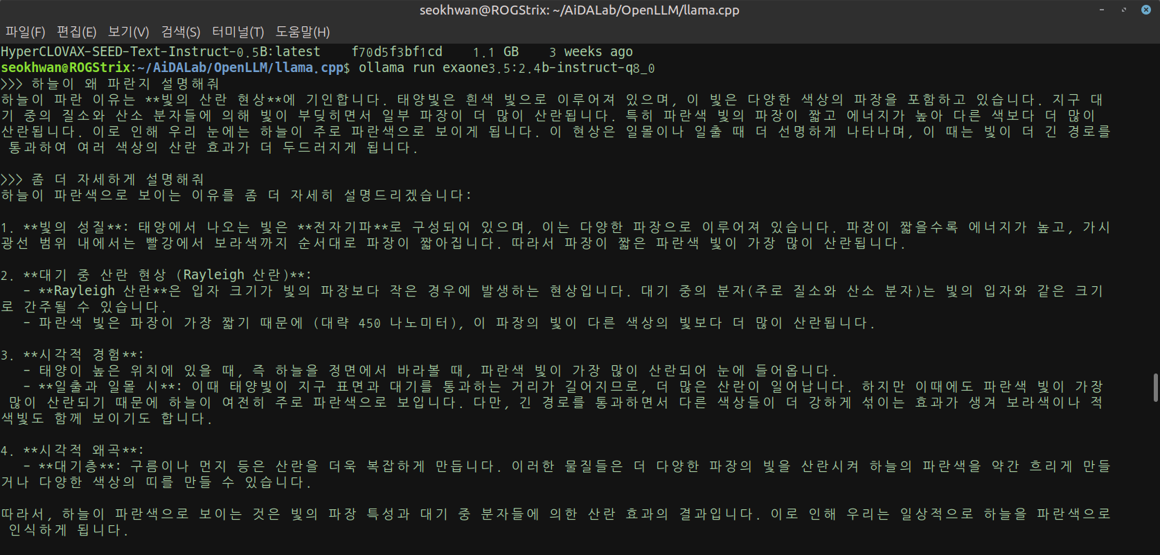그러나 HyperCLOVA-SEED 0.5B/1.5B와 ExaOne-3.5 q8에 비해서 대답할 때까지 상당히 긴 시간이 소요됩니다.