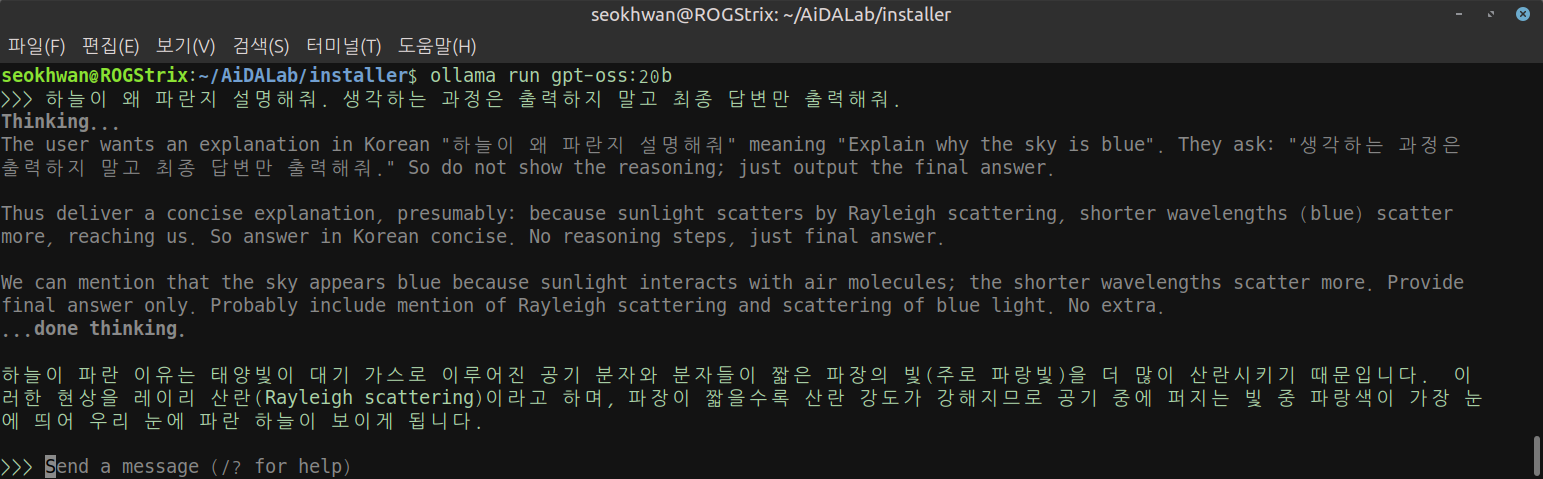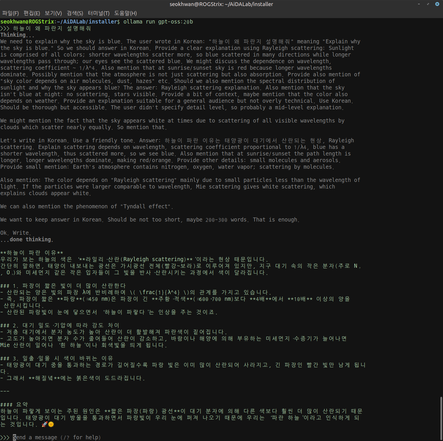 물론 고차원적인 질문과 요청이 들어간다면 전혀 다른 결과가 나오겠지만 테스트 정도의 간단한 질문에서는 GPT-OSS:20B는 과하다고 생각되네요.