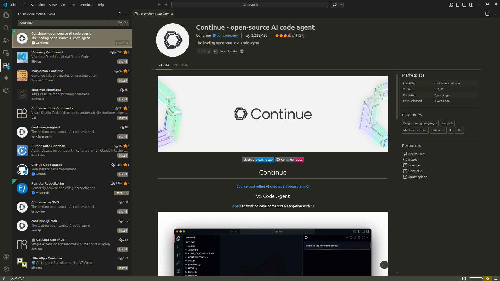 2.1 VSCode 마켓플레이스에서 Continue 확장을 설치합니다.