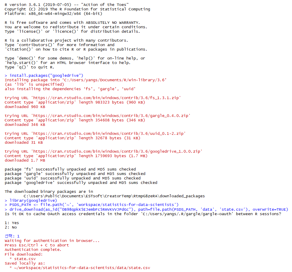 위의 코드에서 보듯이 install.packages("googledrive") 라는 코드로 라이브러리의 설치가 가능합니다.