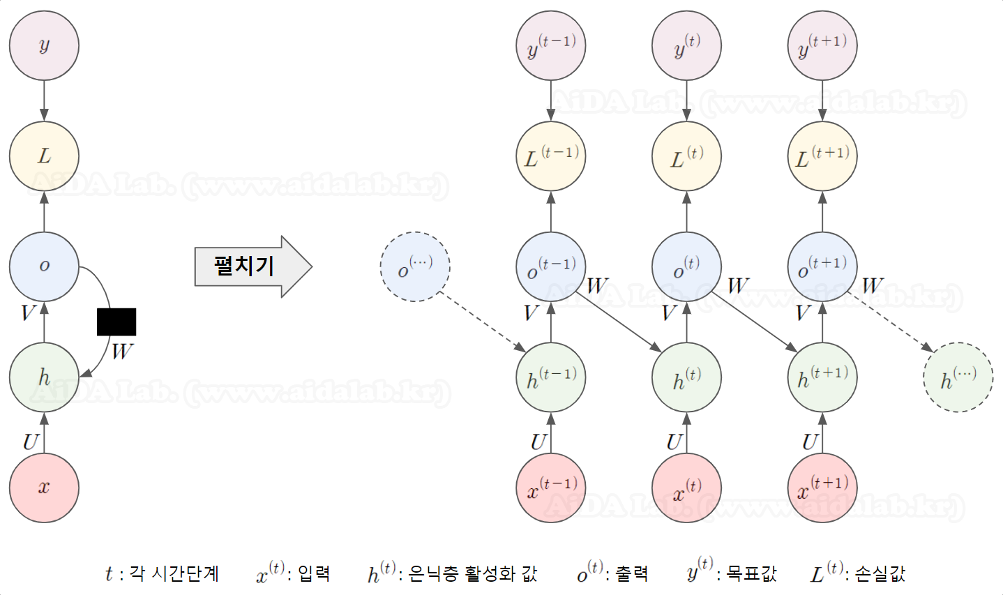 일단 여기서는 순환신경망(Recurrent Neural Network)은 사슬(체인)형태의 계산 그래프를 사용하여 구현되는 모델이며 재귀신경망(Recursive Neural Network)은 트리형태의 계산 그래프를 사용하여 구현되는 모델이라는 정도만 알아두세요.