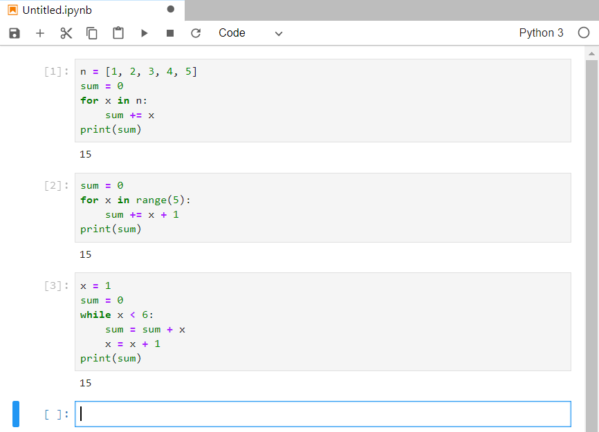 sum += x + 1 # range함수는 0부터 세기 시작하므로 0, 1, 2, 3, 4 의 값을 가져옴
