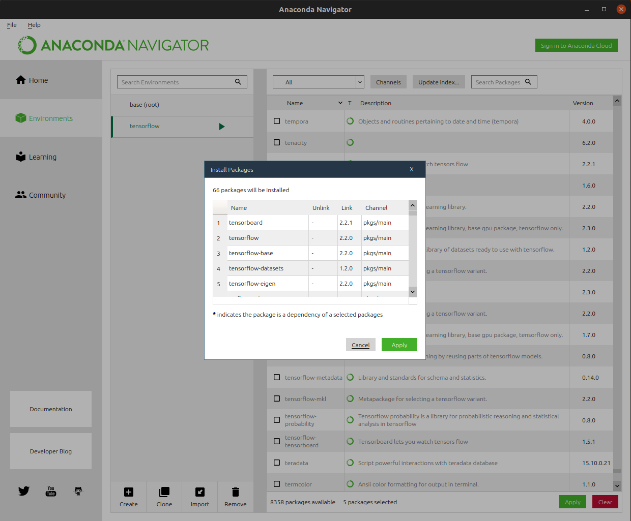 다음으로 텐서플로우를 가상환경에 설치해 주어야 하는데 오른쪽에 보면 리스트가 있죠.