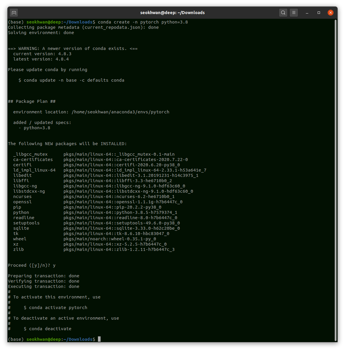 먼저 conda 명령어를 이용하여 파이토치용 가상환경을 만듭니다.