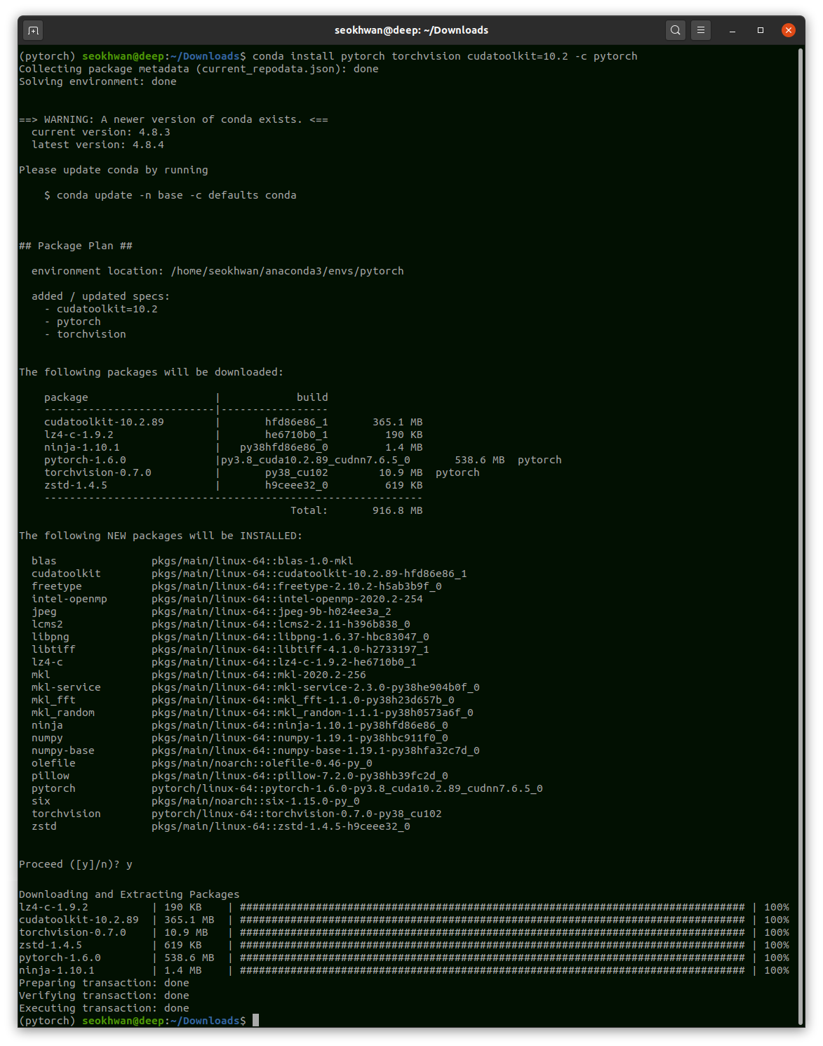(pytorch) $ conda install pytorch torchvision cudatookit=10.2 -c pytorch