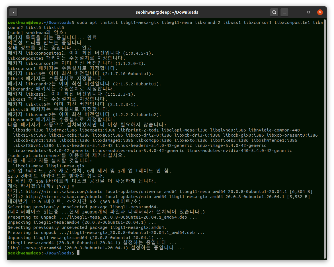 다운로드 한 설치 스크립트를 실행하기 전에 GUI 도구인 Anaconda Navigator를 설치할 수 있도록 기본 라이브러리들을 설치해야 하는데 만약 해당 라이브러리들이 없다면 GUI 없이 설치되므로 GUI를 원하지 않을 경우 해당 명령줄을 빼고 진행하면 됩니다.