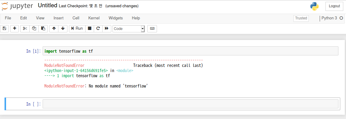 그리고 그냥 파이썬3을 선택하여 파일을 만들었을때는 텐서플로우의 인식을 성공한 경우에도 다음 코드로 넘어가면 또 문제가 발생하기 시작했습니다.