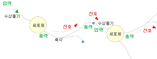다음의 그림은 신경세포 간의 입, 출력 흐름을 표시하고 있습니다.