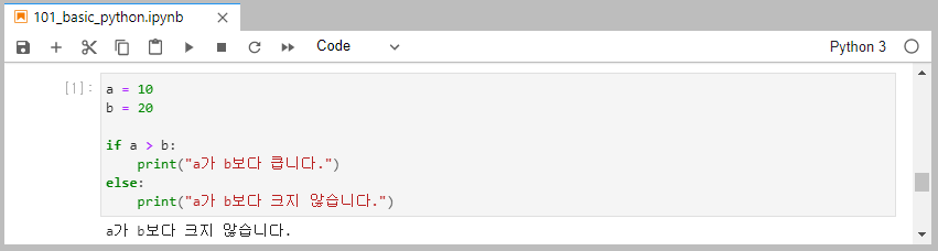 if a > b: 와 같이 마지막에 콜론( : )이 붙어있습니다.