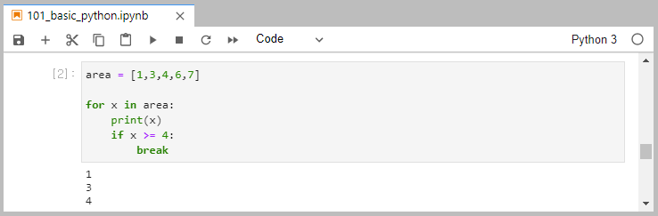 리스트 area의 세 번째 값인 4가 x에 할당되었을 때, if 문을 만나지만 if 문 이전에 print(x)를 만나기때문에 4까지 출력이 되고 종료하게 됩니다.