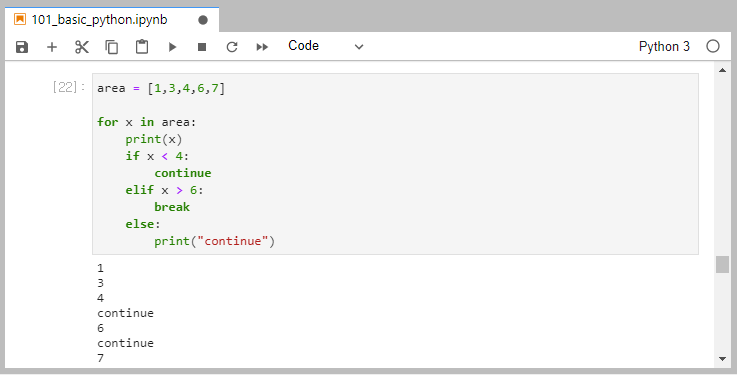 위의 예제에서는 if 문에서 다루는 조건은 x가 4보다 작은 경우는 continue, x가 6보다 큰 경우는 break를 만납니다.