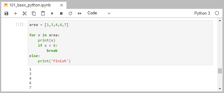 그러나 어쨋든 break로 for문이 중단된 것이기때문에 else 구문 안의 print('Finish')는 실행되지 않았습니다.