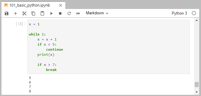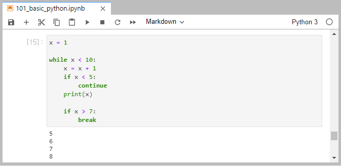 x의 처음 값은 1이니까 1씩 증가하다가 x = 5가 되는 순간부터 continue 명령을 벗어나서 print(x)를 실행하게 됩니다.